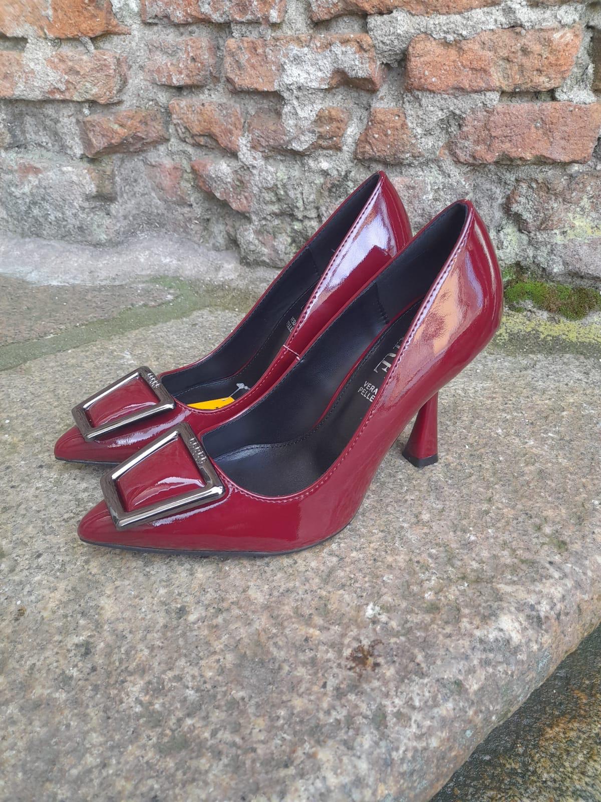 Décolleté da donna elegante in vernice bordeaux, caratterizzata da una linea raffinata e femminile. La punta open toedona un tocco sensuale e leggero, mentre la fibbia metallica decorativa sul davanti aggiunge personalità e stile. Il tacco valorizza la silhouette, mantenendo un equilibrio armonioso tra eleganza e comfort.
